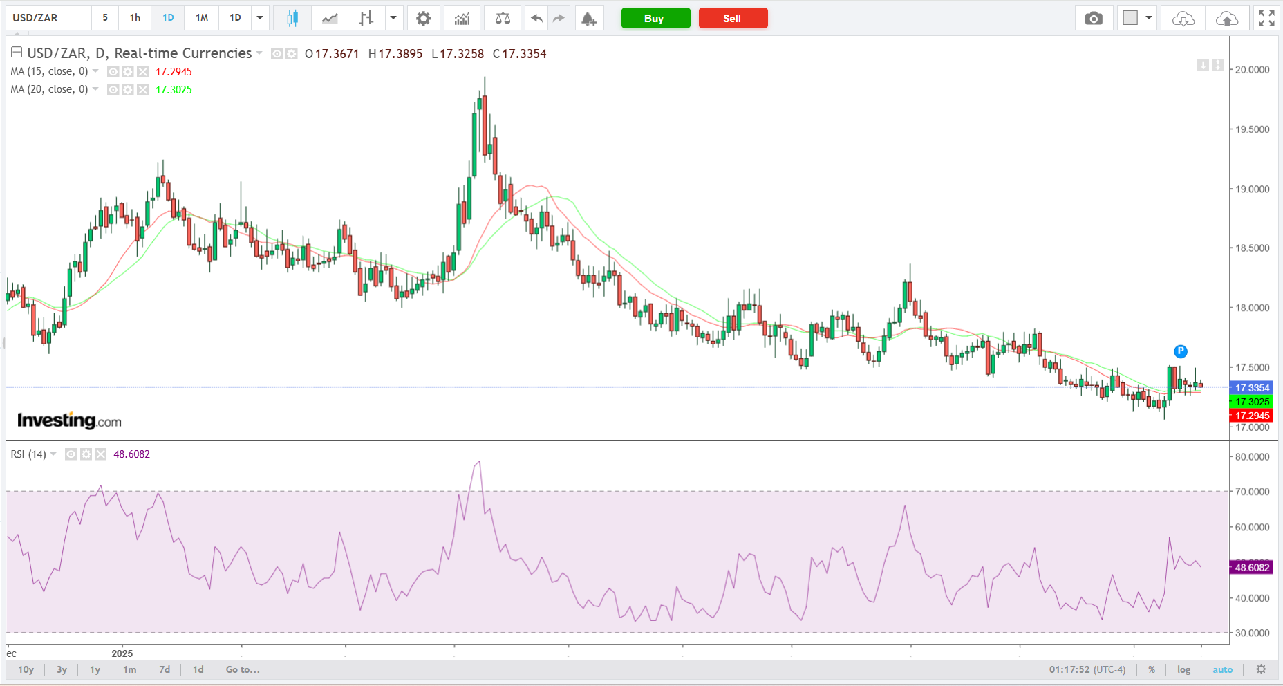 USDZAR is currently trading around 17.33, consolidating after a mild rebound from last week’s lows near 17.05. The pair has struggled to establish clear directional momentum, with price action oscillating in a tight range between 17.20–17.50 over recent sessions. Broader sentiment remains cautious as investors balance a weaker dollar tone against South Africa’s persistent fiscal and energy-related challenges.
