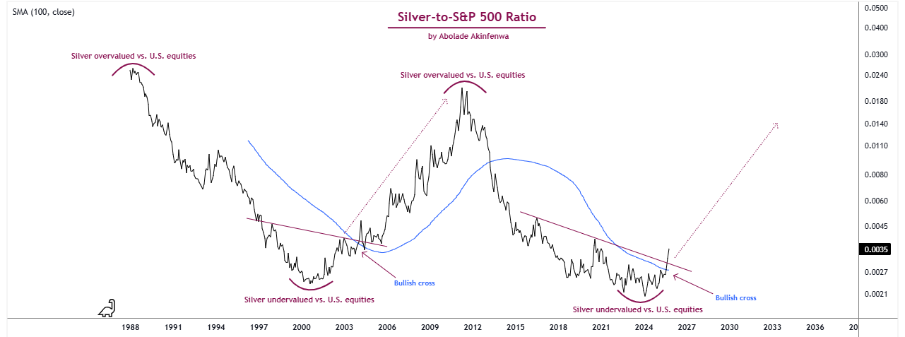 The same dynamic shows up when you compare silver to US equities. After spending more than a decade losing ground, the silver-to-S&P 500 ratio has finally broken out of its downtrend, confirmed by a bullish moving-average crossover. That’s a textbook sign of capital rotation: money is flowing out of overvalued paper assets and into underowned tangible ones.