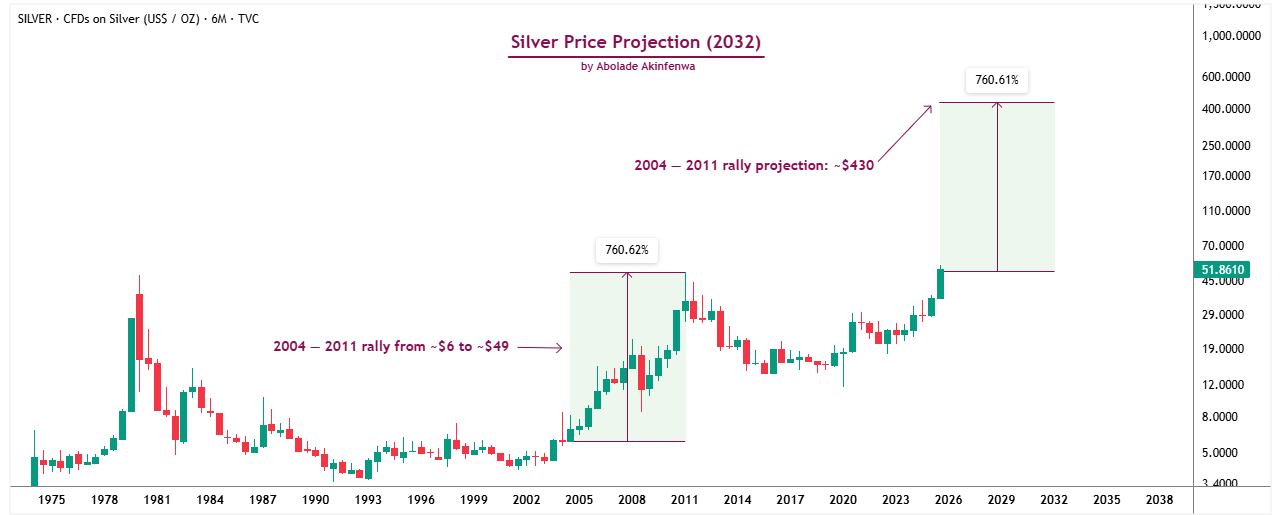 The last time we saw this exact setup was in 2004, right before silver launched a 760% rally, climbing from $6 to $49 per ounce by 2011. If history rhymes, this breakout could propel silver toward $430 by 2032. That may sound ambitious, but so did $49 by 2011 when silver was trading around $6 in 2004. And as you’ll find out later in the technical outlook section, that same target aligns with two other long-term projections, giving it even more weight.