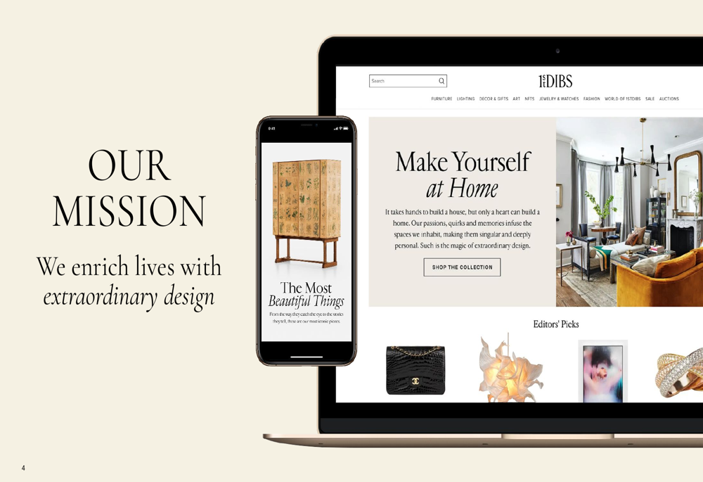 The presentation underscores 1stDibs’s commitment to its mission of "enriching lives with extraordinary design" through its multi-channel platform: