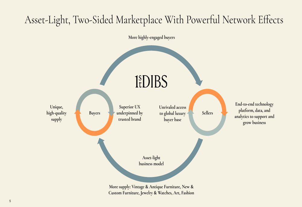 The presentation emphasizes 1stDibs’s technology-driven approach to capturing market share in the luxury goods sector. The company highlights four key strategic advantages: a large market opportunity in luxury goods with low online penetration, a unique and trusted luxury brand name, durable two-sided network effects, and a highly-scalable technology platform with an asset-light business model.