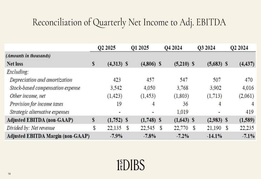 For Q2 2025, 1stDibs reported Gross Merchandise Value (GMV) of $89.9 million and revenue of $22.1 million. The company posted an Adjusted EBITDA loss of $1.8 million for the quarter, continuing a pattern of negative EBITDA margins that have persisted across recent reporting periods.
