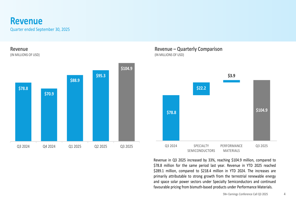 5N Plus reported Q3 2025 revenue of $104.9 million, representing a 33% increase compared to $78.8 million in the same period last year. This figure exceeded analyst expectations of $94.56 million by 10.93%. The revenue growth trend has been consistent over the past five quarters, as illustrated in the following chart: