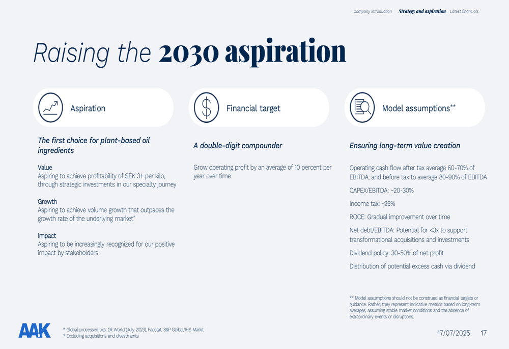AAK has raised its 2030 aspiration to become the first choice for plant-based oil ingredients while delivering double-digit compound growth. The company’s financial target is to grow operating profit by an average of 10% per year over time, supported by a comprehensive financial framework: