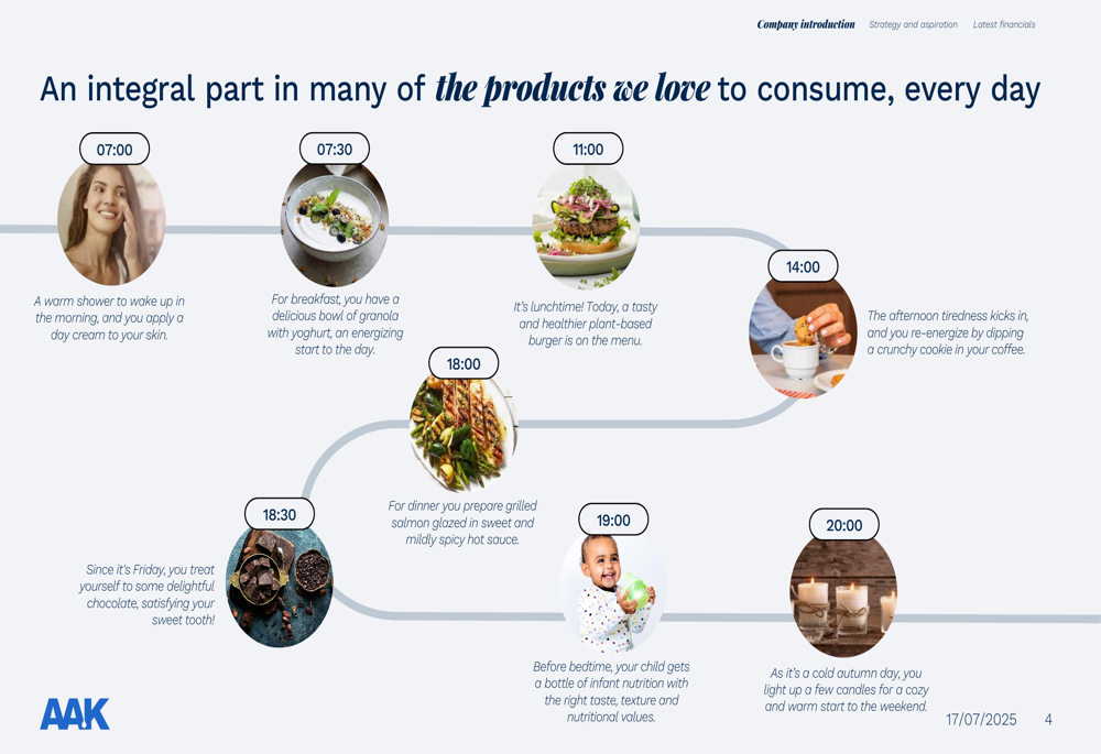 AAK highlights how its products are integrated into various aspects of daily life, from morning skincare routines to evening meals, positioning the company as an essential provider of ingredients for everyday consumer products: