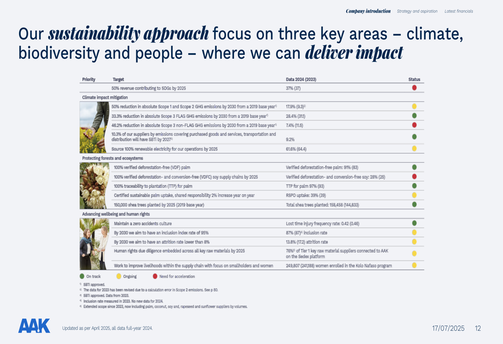 Sustainability remains a core focus for AAK, with the company tracking progress across three key areas: climate impact mitigation, protecting forests and ecosystems, and advancing wellbeing and human rights. The presentation highlighted that 91% of AAK’s palm oil is now verified deforestation-free, moving toward its target of 100%.