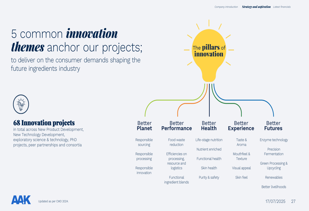 AAK is also making selective investments in emerging technologies with the potential to drive significant impact in the oils and fats industry. These include developing new plant-based oil sources, fermented microbial oils, and Power-to-X technologies that convert carbon dioxide, water, and energy into organic materials.