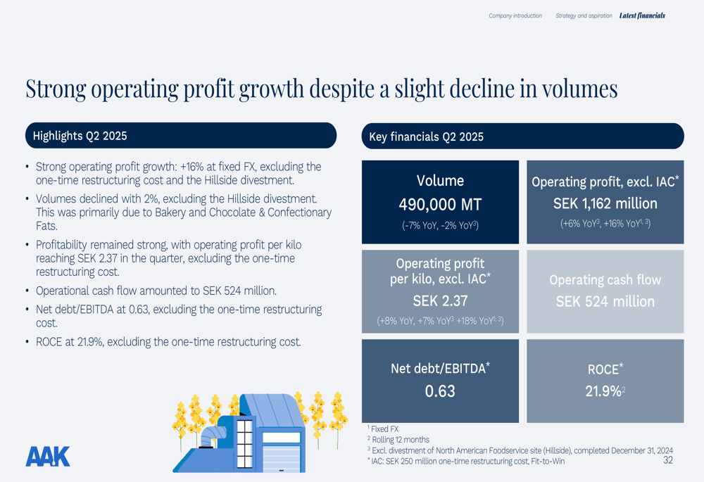 AAK’s Q2 2025 results demonstrated resilience in a challenging market environment. The company achieved an operating profit of SEK 1,162 million, representing a 16% year-over-year increase at fixed exchange rates when excluding one-time restructuring costs and the Hillside divestment. Profitability remained strong with operating profit per kilo reaching SEK 2.37, an 18% increase year-over-year at fixed exchange rates.