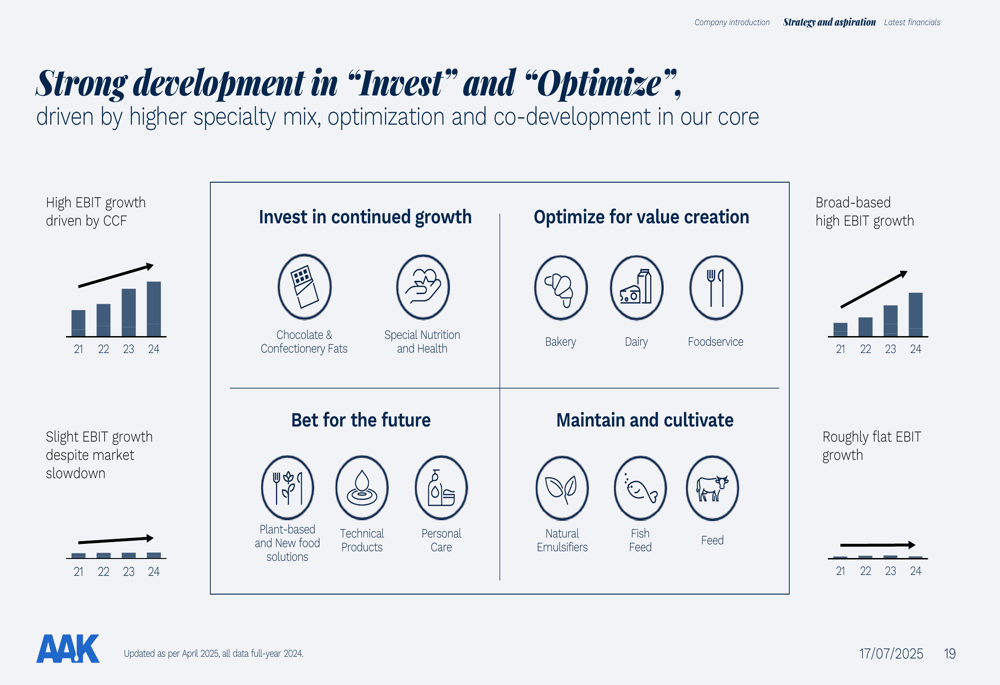 AAK’s presentation emphasized its ongoing transformation from a decentralized, unaligned organization to one that is increasingly aligned while maintaining decentralized operations. This strategic shift is driving improved performance across the company’s global footprint, as illustrated in the following slide: