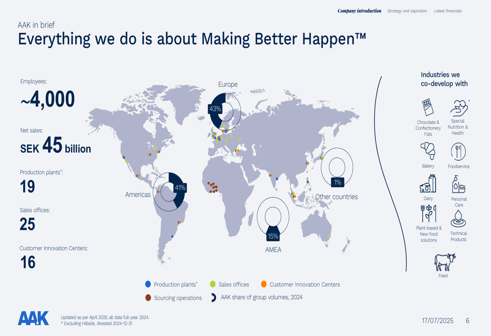 The company’s global presence spans multiple industries, with 43% of volume in Europe, 41% in the Americas, and 15% in Asia, Middle East, and Africa. AAK operates 19 production plants, 25 sales offices, and 16 customer innovation centers worldwide, serving industries ranging from chocolate and confectionery to personal care and technical products.