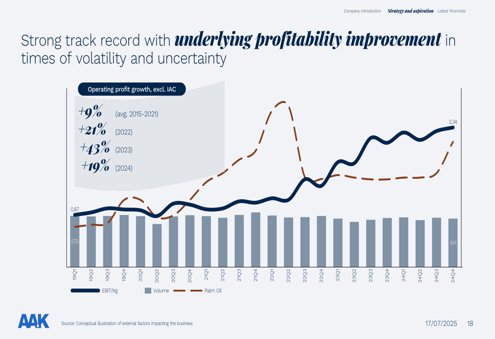 The company’s confidence in these targets is bolstered by its strong historical performance. AAK has demonstrated consistent profitability improvement even during periods of market volatility, with average operating profit growth of 9% from 2015-2021, followed by accelerated growth of 21% in 2022, 43% in 2023, and 19% in 2024.