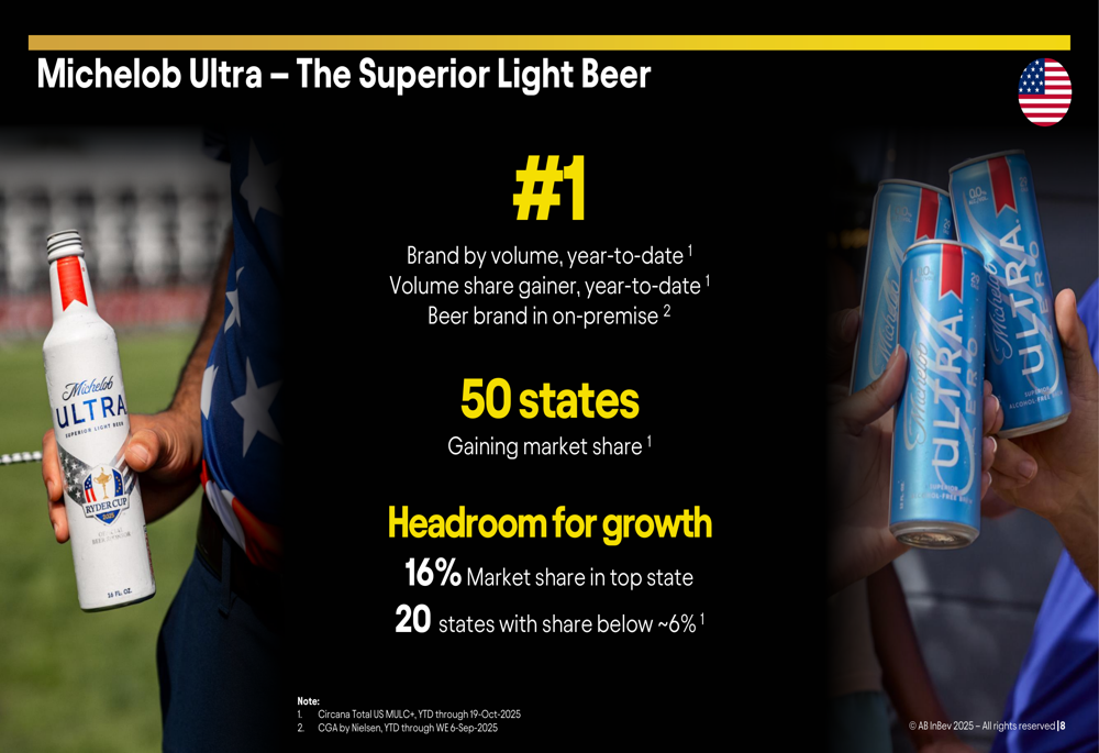 In North America, AB InBev reported a 0.7% revenue decline but managed to grow EBITDA by 0.4%, achieving an EBITDA margin of 35.1%. The region’s performance was highlighted by Michelob Ultra becoming the number one beer brand by volume in the United States year-to-date, a significant milestone for the company.