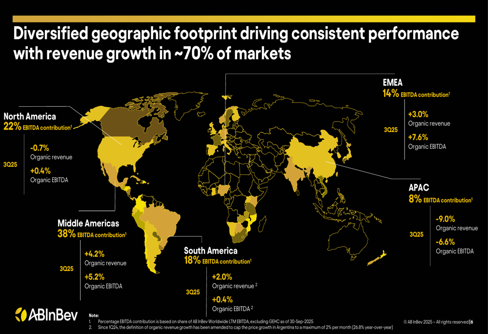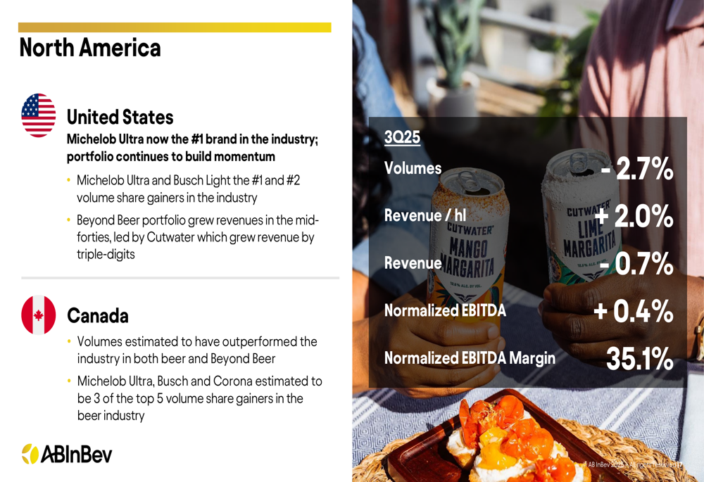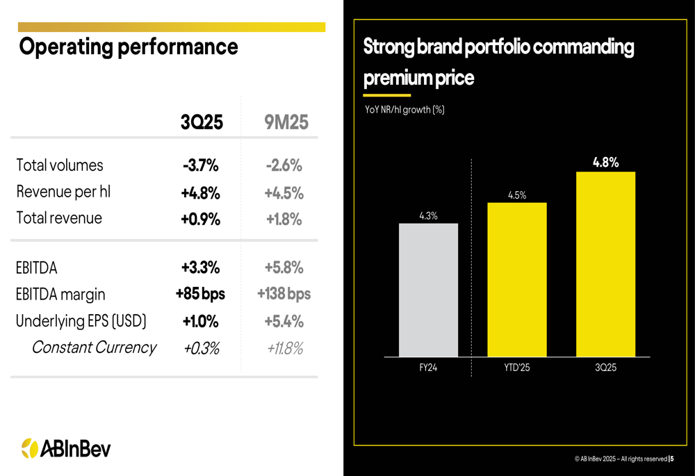 AB InBev’s Q3 2025 results revealed a consistent pattern of volume challenges offset by pricing power and premium brand performance. Total volumes declined by 3.7% in Q3 and 2.6% for the first nine months of 2025, but revenue per hectoliter grew by 4.8% in the quarter, allowing for total revenue growth of 0.9%.