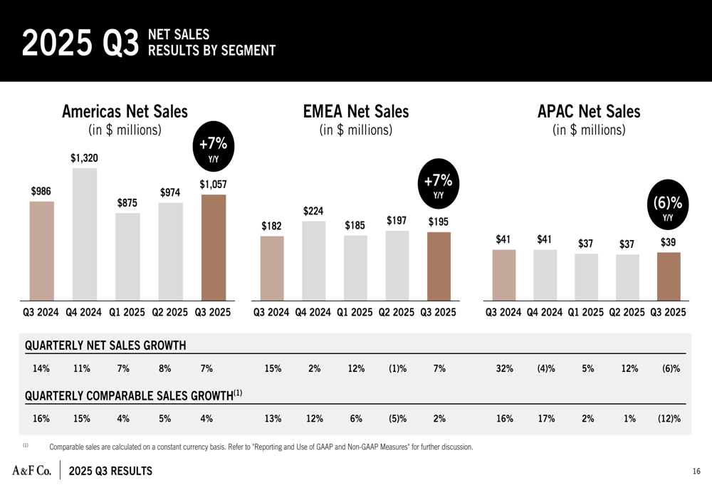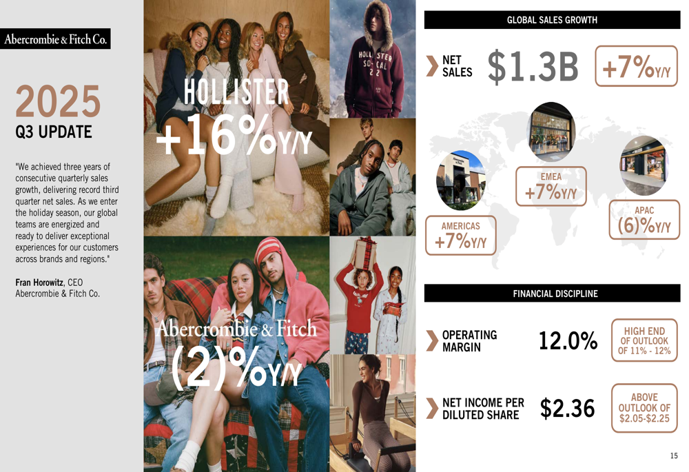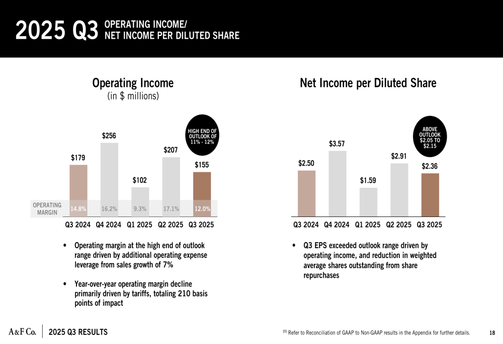 Abercrombie & Fitch reported net sales of $1.3 billion for Q3 2025, representing a 7% increase year-over-year. Operating income reached $155 million, resulting in an operating margin of 12.0%, which was at the high end of the company’s outlook range despite being lower than the 14.8% reported in Q3 2024.