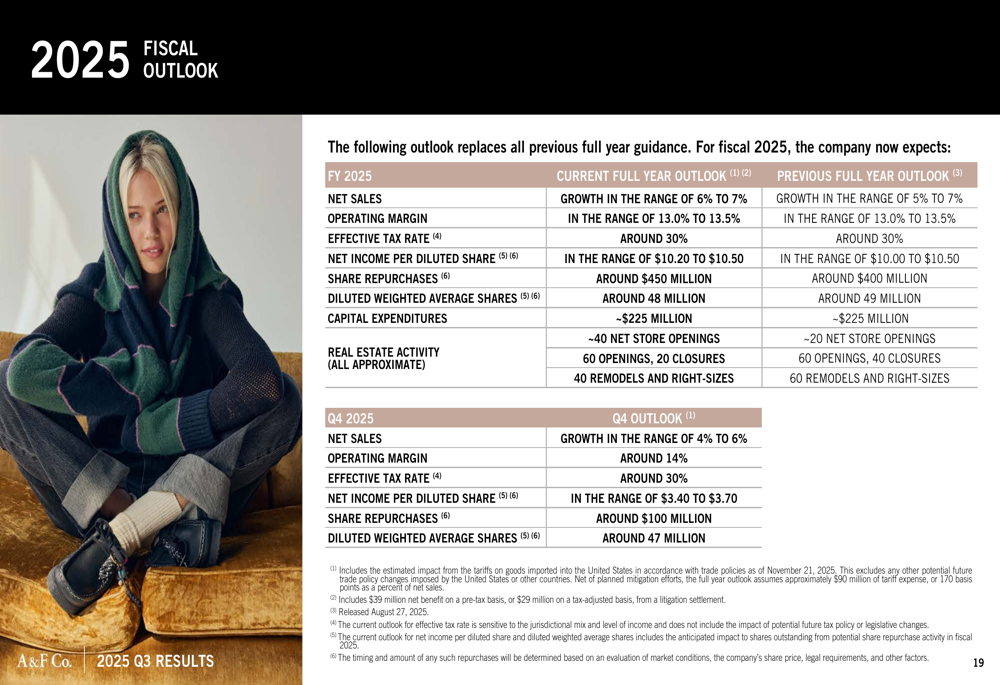 Looking ahead, Abercrombie & Fitch raised its full-year outlook, now expecting net sales growth of 6-7% (up from 5-7% previously) and earnings per diluted share of $10.20-$10.50 (improved from $10.00-$10.50). The company also increased its share repurchase target to approximately $450 million for FY 2025, up from $400 million previously: