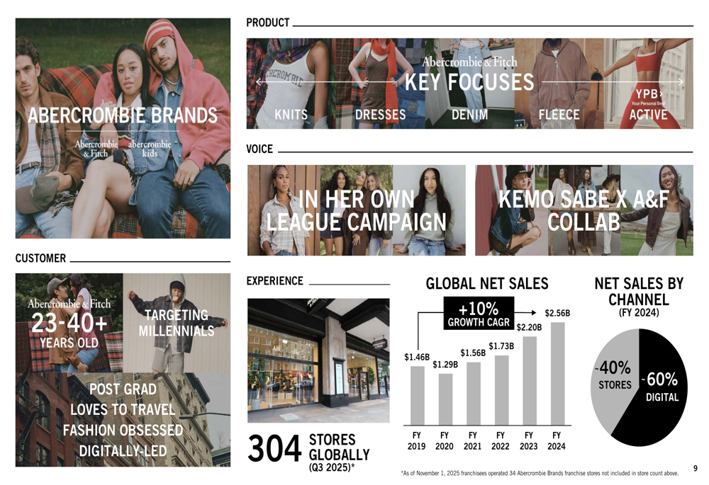 This performance divergence between brands reflects their distinct market positioning and customer bases. Abercrombie Brands target millennials aged 23-40+, with 60% of sales coming through digital channels: