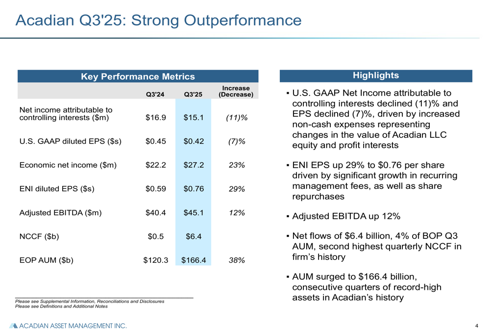 Acadian reported mixed GAAP results for Q3 2025, with net income attributable to controlling interests decreasing 11% year-over-year to $15.1 million and diluted EPS falling 7% to $0.42. However, the company’s preferred profitability metrics showed substantial improvement, with economic net income (ENI) increasing 23% to $27.2 million and ENI diluted EPS rising 29% to $0.76.