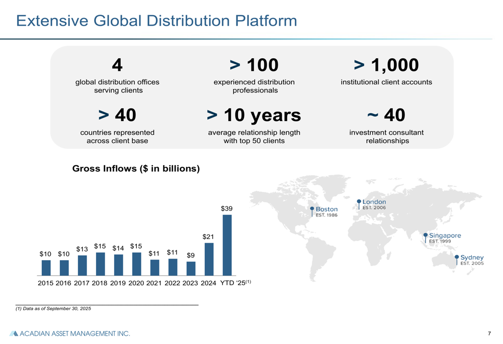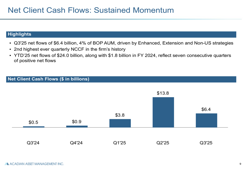 The company’s net client cash flows have shown sustained momentum over recent quarters, with Q3 2025 representing the second-highest quarterly inflow in Acadian’s history: