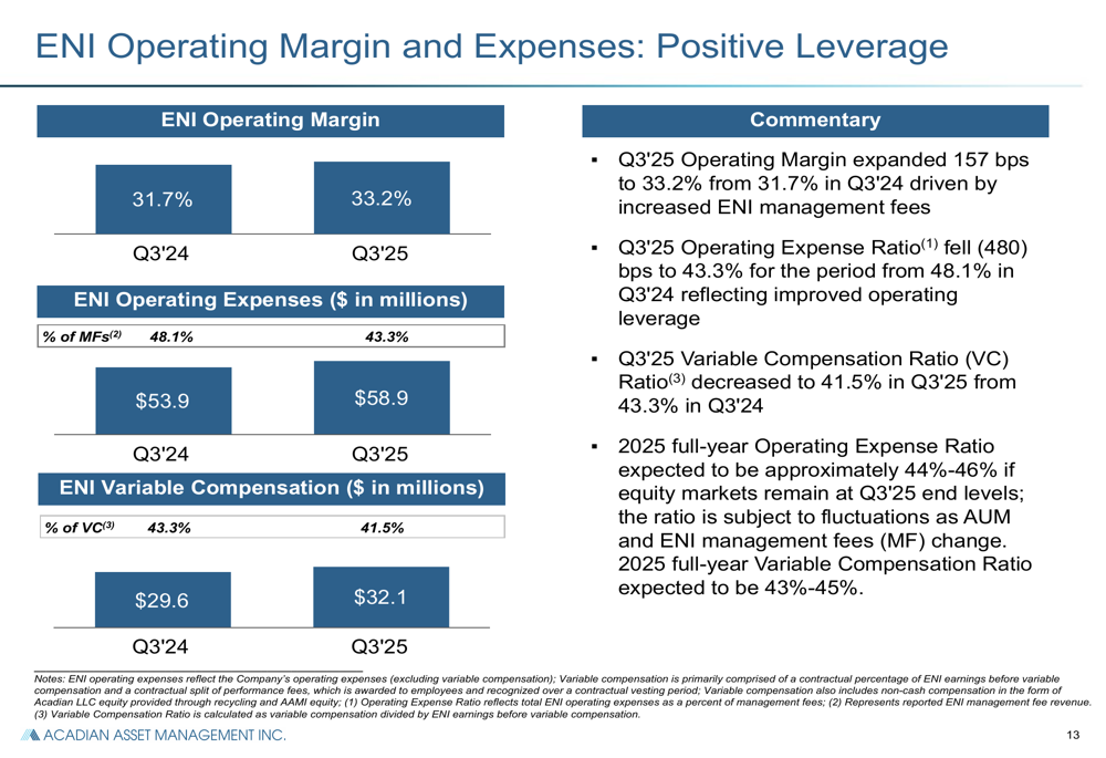 Acadian’s ENI revenue reached $136.3 million in Q3 2025, representing a 12% increase from the prior year. This growth was driven entirely by management fees, which rose 21% to $136.1 million, reflecting a 34% increase in average AUM. However, performance fees declined significantly to just $0.2 million from $10.1 million in Q3 2024.