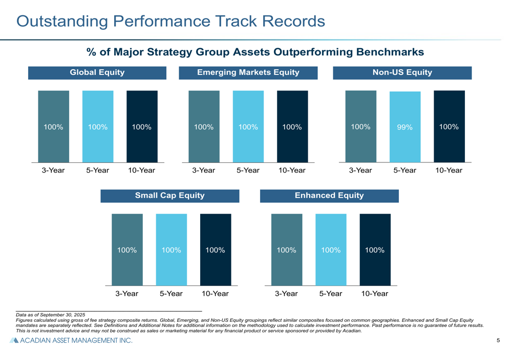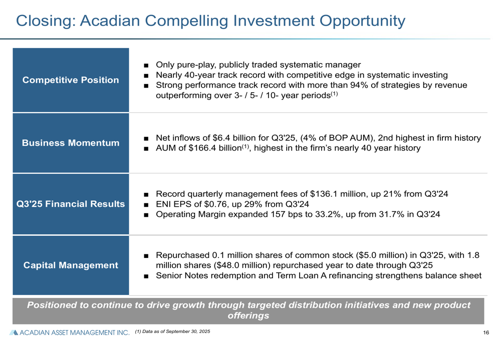 The company emphasized its position as the only pure-play publicly traded systematic manager, highlighting its long-term investment outperformance and global distribution capabilities as key competitive advantages. With $166.4 billion in assets under management, Acadian has leveraged its quantitative approach across multiple strategy groups including global equity, emerging markets, and enhanced equity products.