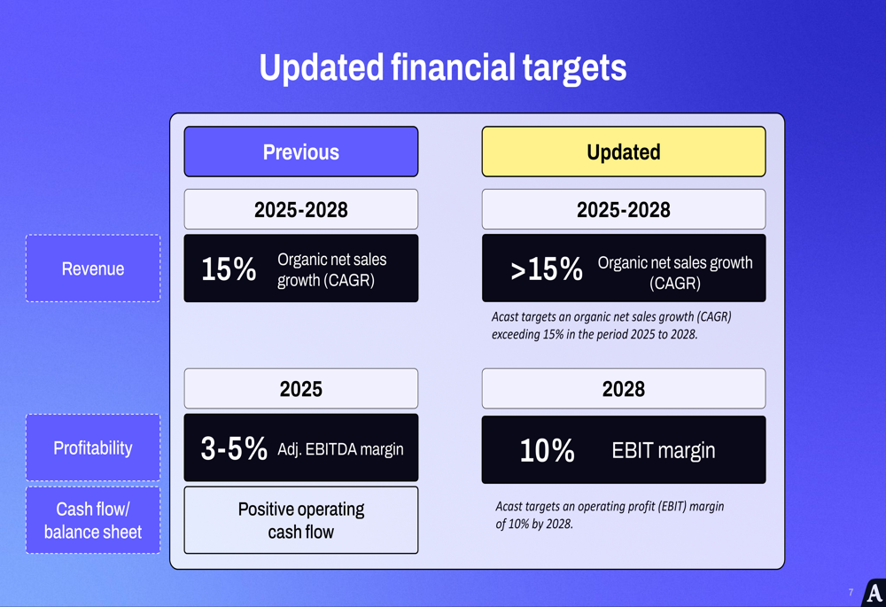 Acast updated its long-term financial targets during the presentation, now aiming for organic net sales growth (CAGR) exceeding 15% for the period 2025-2028, and targeting an operating profit (EBIT) margin of 10% by 2028.