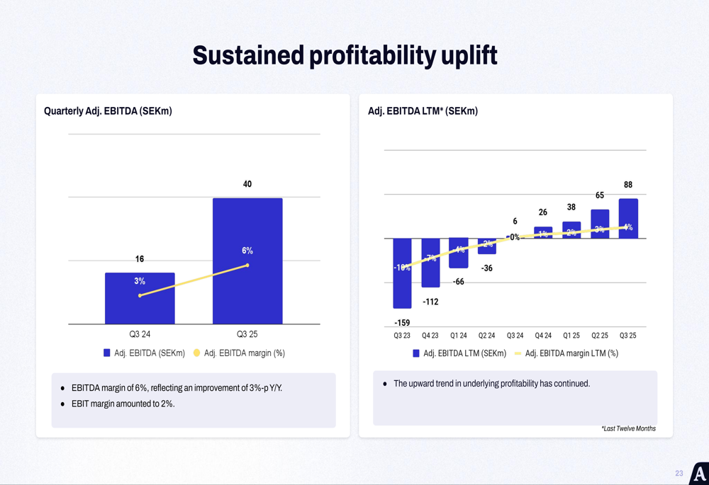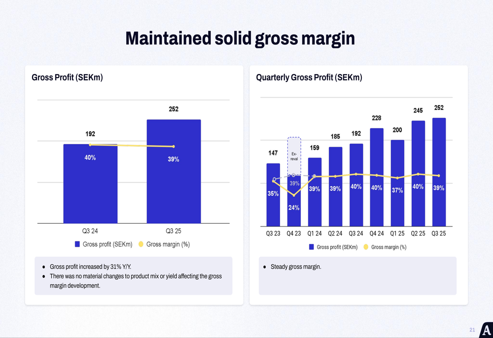 The company’s gross profit increased by 31% year-over-year to SEK 252 million, maintaining a solid gross margin of approximately 40% despite rapid expansion.