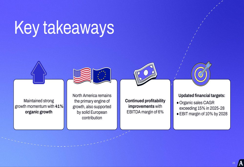 The company’s key takeaways from the quarter emphasize its strong organic growth, North America’s role as the primary engine for future expansion, continued profitability improvements, and confidence in meeting updated financial targets.