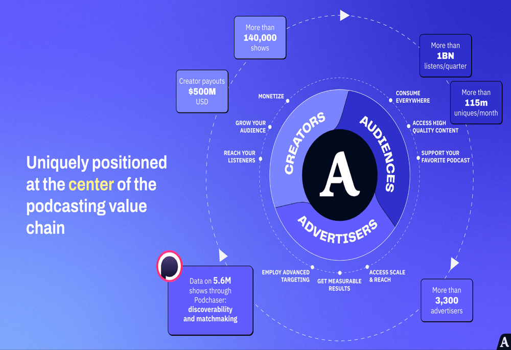The company also highlighted its unique position in the podcasting value chain, sitting at the center of the ecosystem connecting creators, audiences, and advertisers.