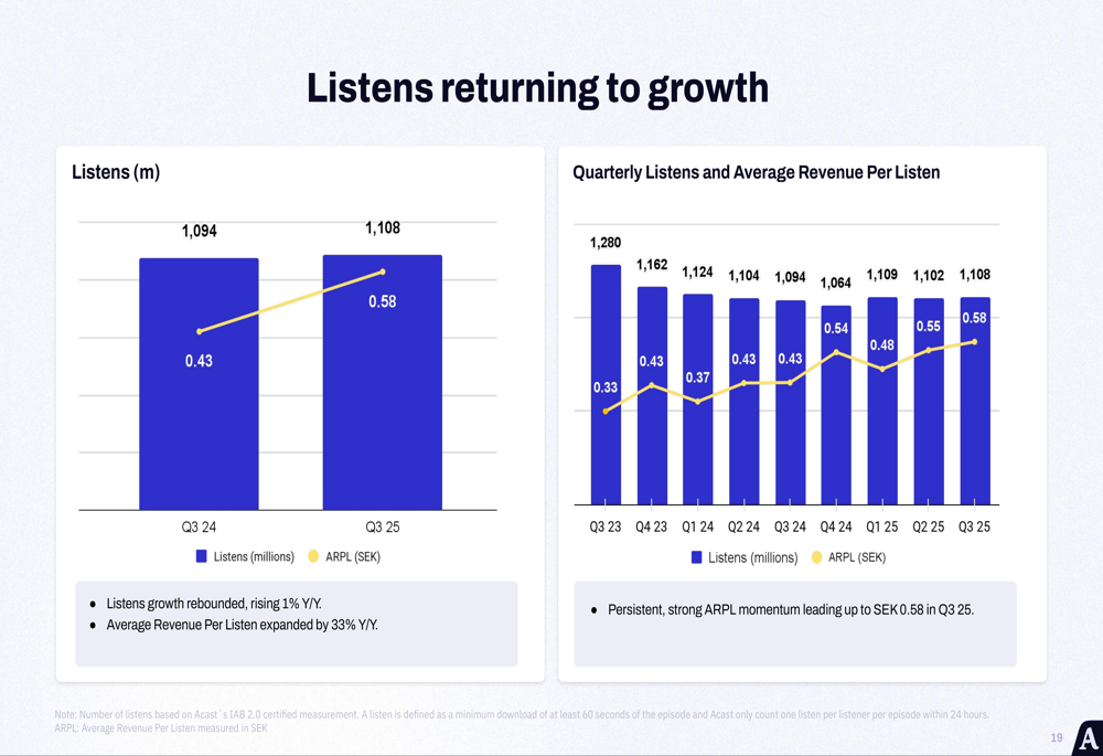 Listens returned to growth in Q3 2025, increasing 1% year-over-year to 1,108 million, while average revenue per listen (ARPL) continued its upward trajectory to SEK 0.58.