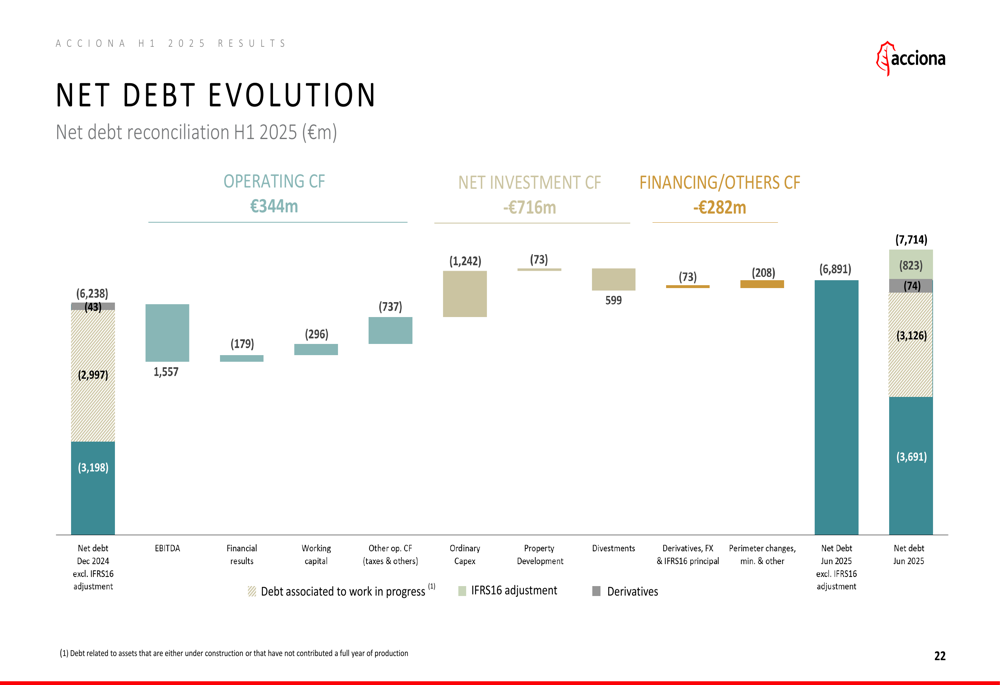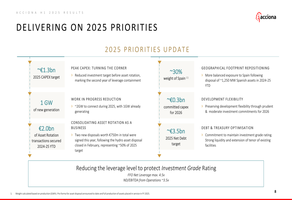 Acciona outlined several key priorities for the remainder of 2025, focusing on deleveraging to protect its investment grade rating. The company is targeting a net debt to EBITDA ratio from operations of approximately 3.5x and is committed to maintaining financial flexibility.