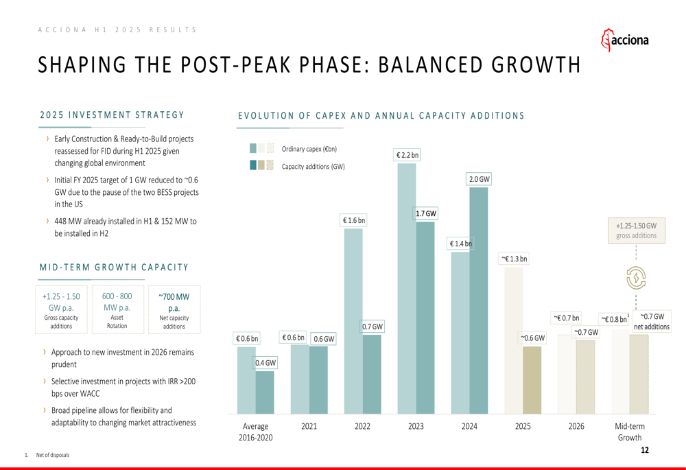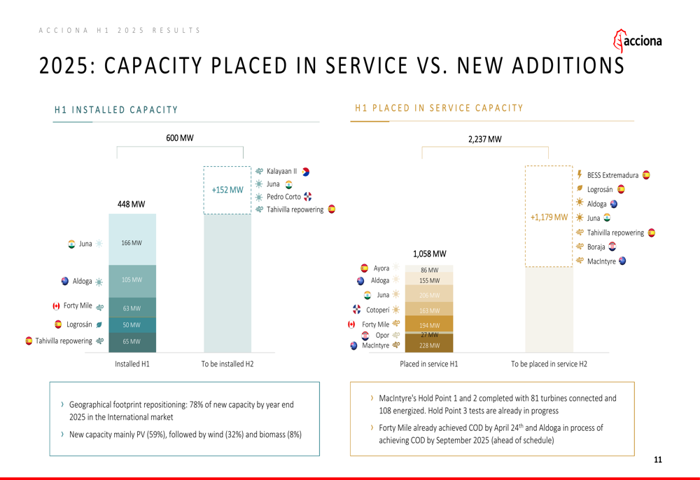 Acciona reported substantial progress in its renewable energy capacity expansion, with 448 MW installed in H1 2025 and 1,058 MW placed in service during the same period. The company has adjusted its 2025 investment strategy, reducing its initial full-year target from 1 GW to approximately 0.6 GW of new capacity.