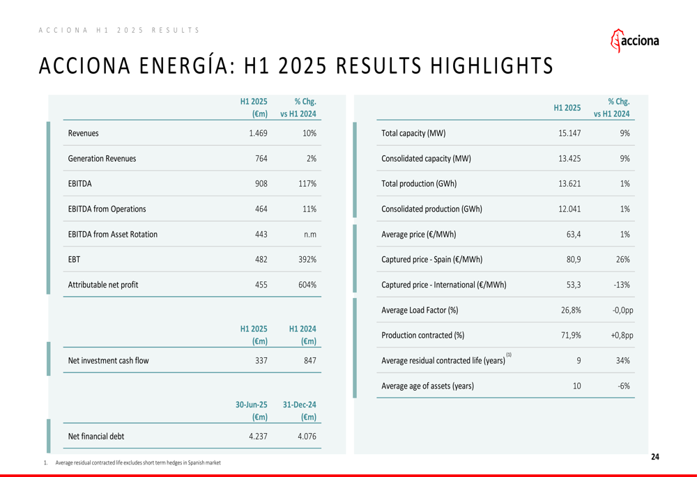 1. ACCIONA Energía: Delivered exceptional results with EBITDA of €908 million, up 117% year-over-year. The energy division’s total capacity reached 15,147 MW (up 9%), with consolidated production increasing by 1% to 12,041 GWh. The average price was €63.4/MWh (up 1%), with 71.9% of production contracted.