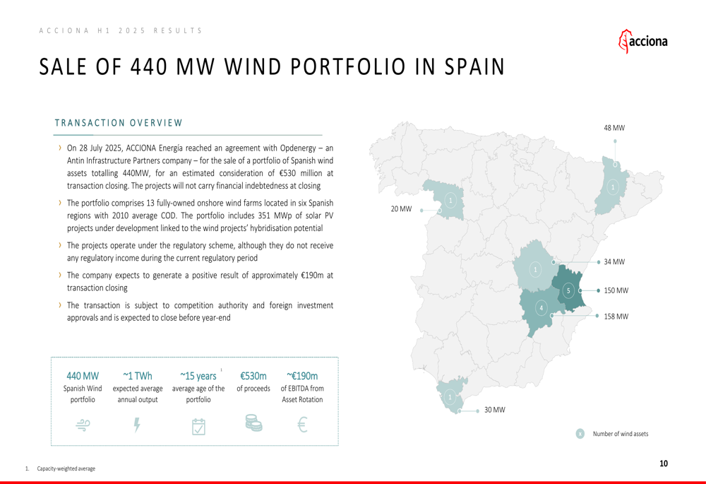 One of the most significant recent transactions was the sale of a 440 MW wind portfolio in Spain to Opdenergy for €530 million, announced on July 28, 2025. This portfolio consists of 13 fully-owned onshore wind farms across six Spanish regions, with an average commissioning date of 2010, and is expected to generate approximately €190 million in EBITDA from asset rotation.