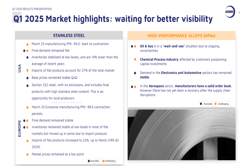 Looking ahead, Acerinox expects Q2 2025 EBITDA to exceed Q1 levels, supported by an improving order book in the stainless steel segment. The company anticipates stability in the US HPA market but lower volumes in Europe.