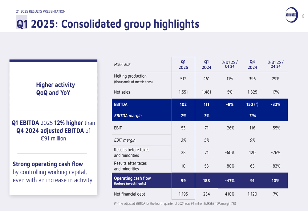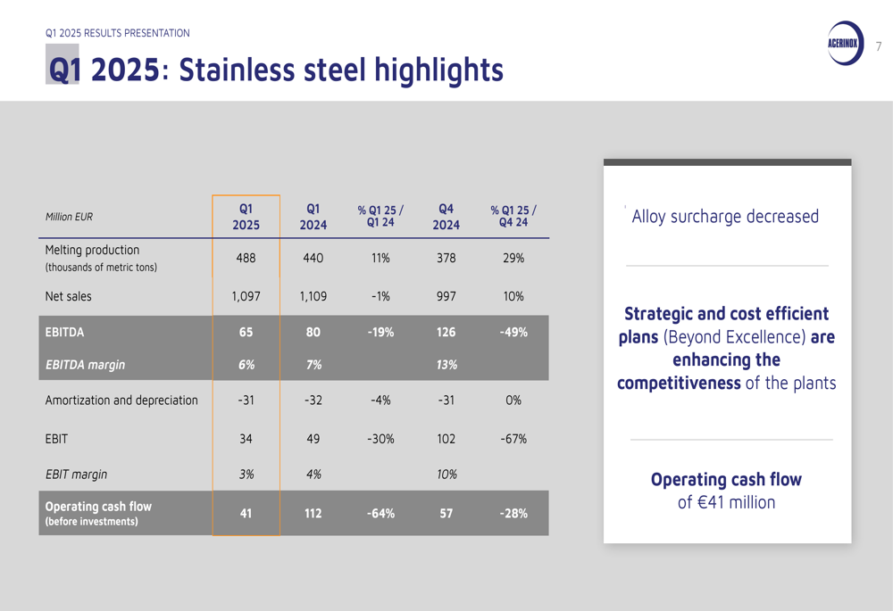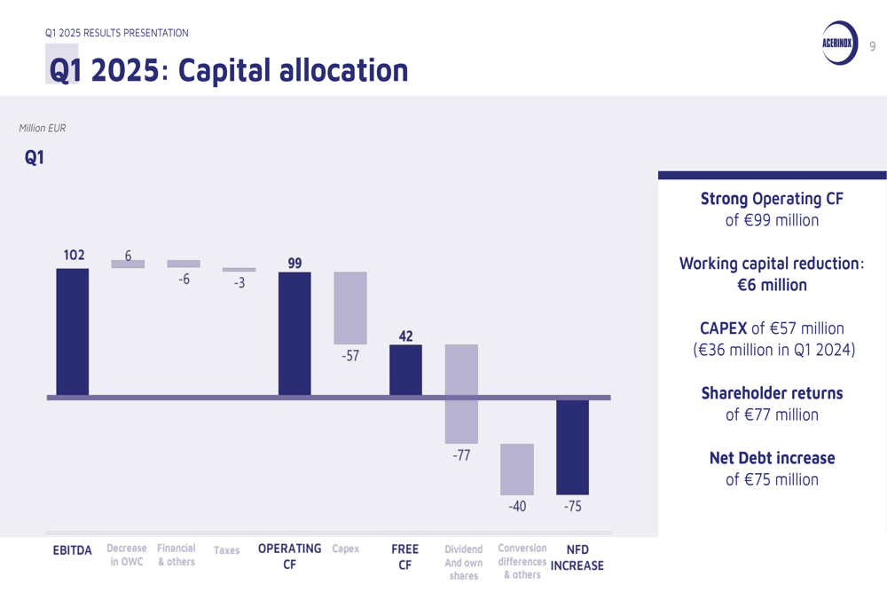 In terms of capital allocation, Acerinox generated €99 million in operating cash flow, invested €57 million in capital expenditures (up from €36 million in Q1 2024), and returned €77 million to shareholders. Despite a €6 million reduction in working capital, net debt increased by €75 million during the quarter.