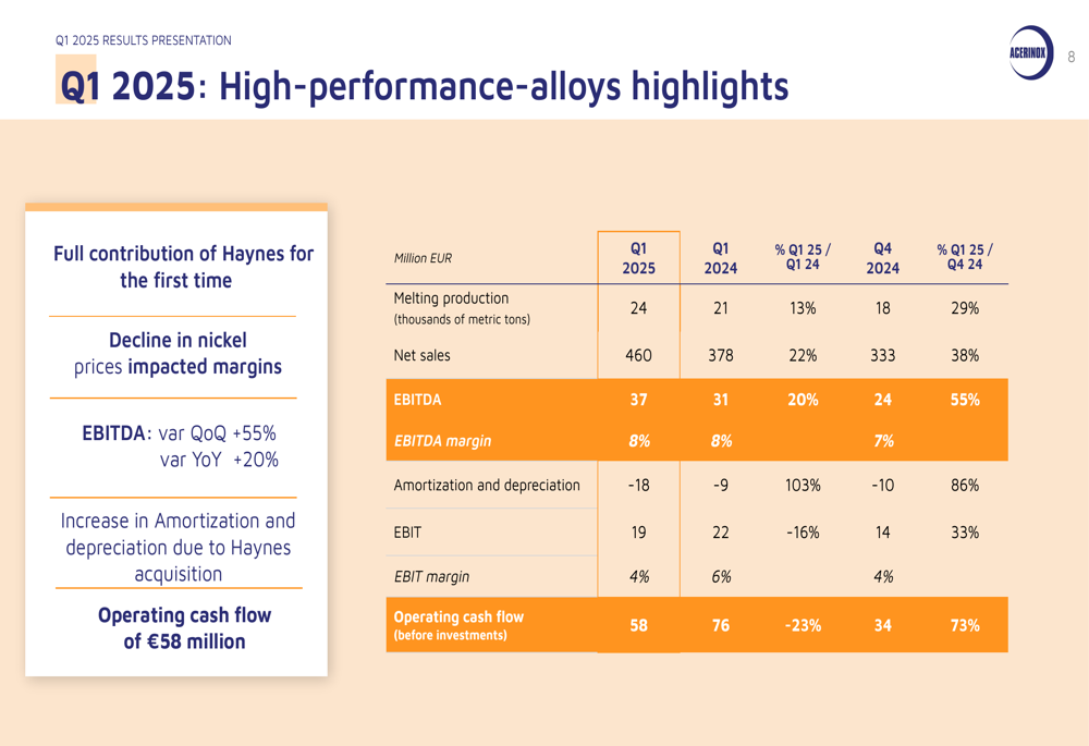 In contrast, the high-performance alloys (HPA) segment demonstrated robust growth, with EBITDA increasing by 55% quarter-over-quarter and 20% year-over-year to €37 million. This segment benefited from the full contribution of Haynes International for the first time, though margins were impacted by declining nickel prices.