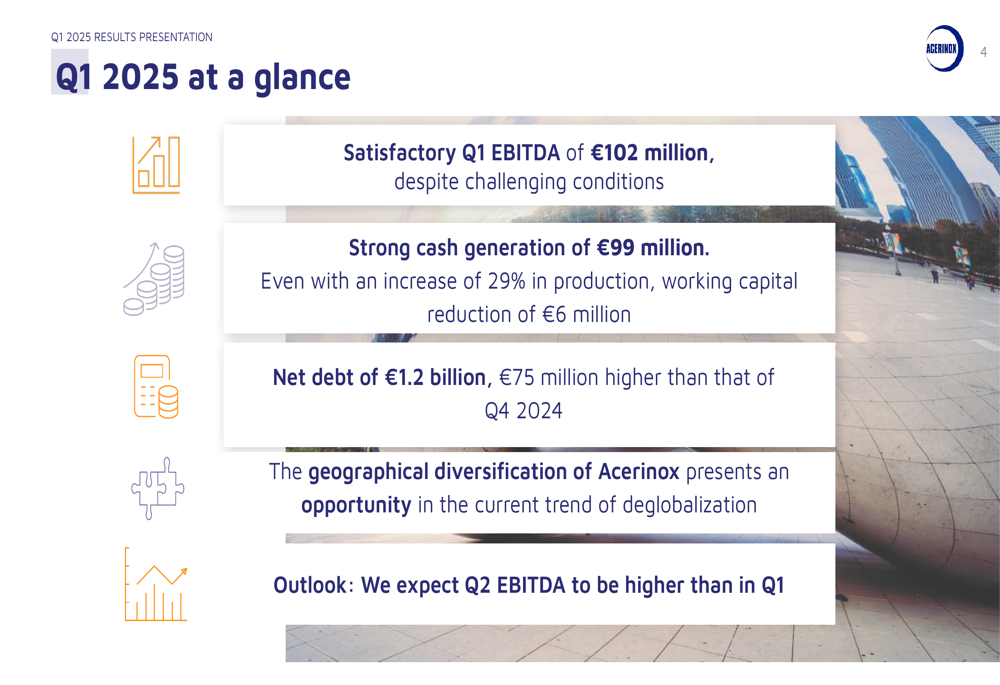 Acerinox generated €99 million in operating cash flow in Q1 2025, nearly matching its EBITDA of €102 million. This strong cash generation occurred despite a 29% increase in production compared to the previous quarter, demonstrating effective working capital management.