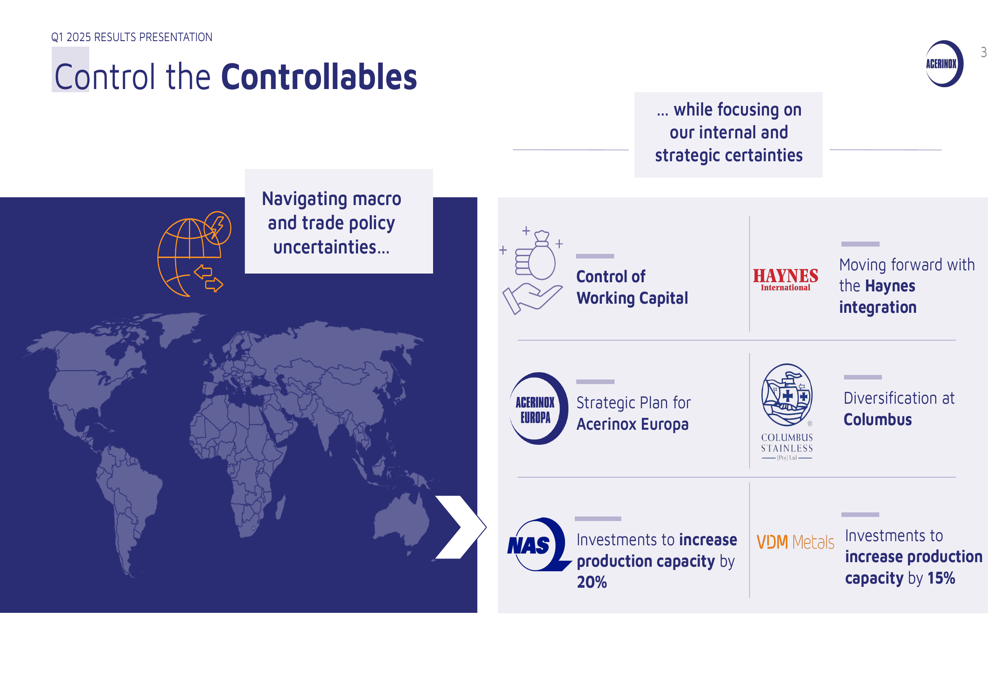 Acerinox’s strategy focuses on "controlling the controllables" amid market uncertainties. The company is implementing strategic initiatives including working capital optimization, capacity expansion at North American Stainless (NAS) by 20% and at VDM Metals by 15%, and diversification at Columbus (WA:CLC) Stainless.