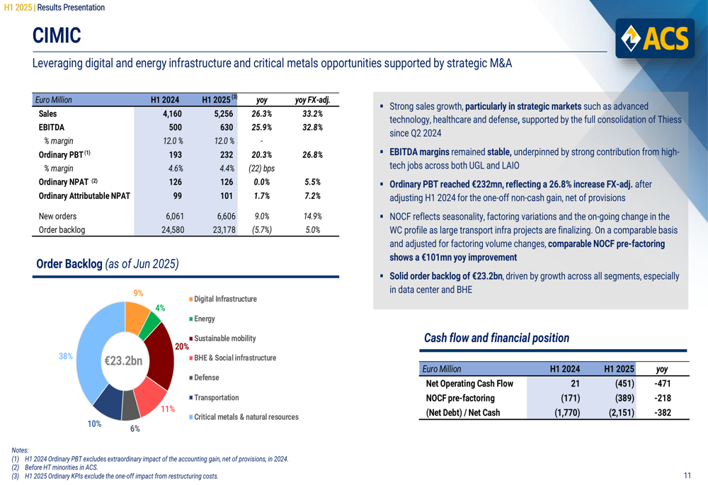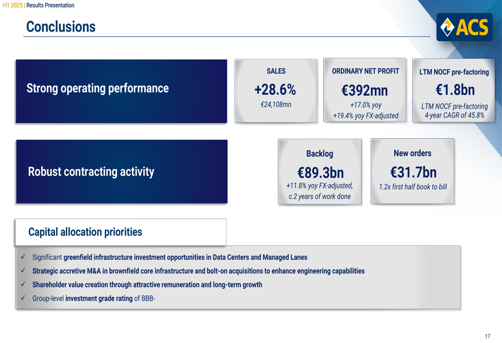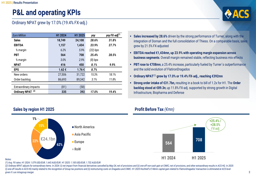 ACS reported sales of €24.1 billion for H1 2025, representing a substantial 28.6% increase (31.8% FX-adjusted) compared to the same period last year. Ordinary net profit grew by 17.0% (19.4% FX-adjusted) to €392 million, while net profit reached €450 million, up 8.1% year-over-year.