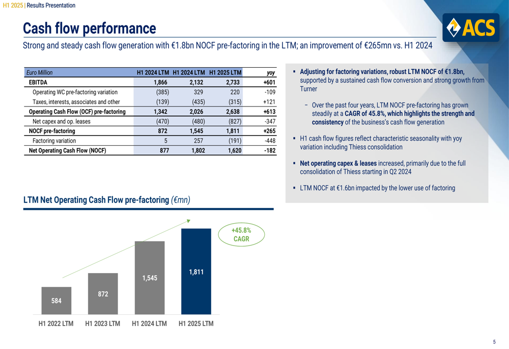 ACS Group maintained strong cash flow generation, with LTM net operating cash flow pre-factoring increasing to €1.8 billion. The company has consistently improved its cash conversion, with a four-year CAGR of 45.8% in this metric.