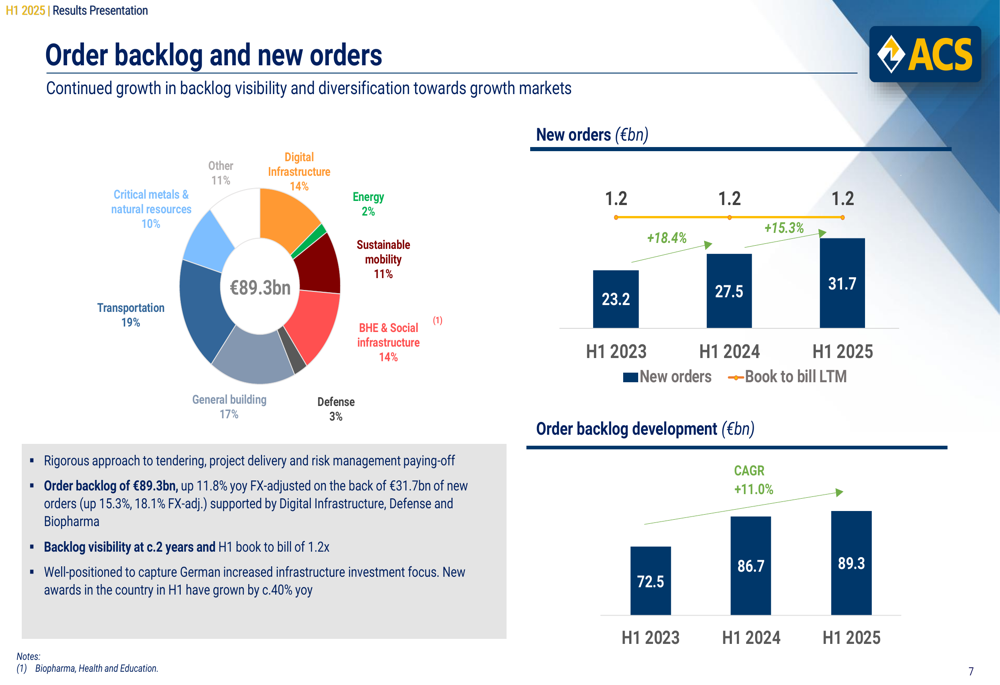 Overall, ACS Group’s H1 2025 results demonstrate strong performance across most business segments, with its strategic focus on digital infrastructure and data centers driving significant growth, particularly in the Turner segment. The company’s robust order backlog and book-to-bill ratio provide a solid foundation for continued growth in the coming years.