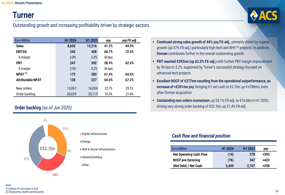 Turner emerged as the standout performer within ACS Group, with attributable net profit surging 64.0% (67.2% FX-adjusted) to €227 million. Sales increased by an impressive 41.2% to €12.2 billion, driven by significant growth in digital infrastructure projects, particularly data centers.