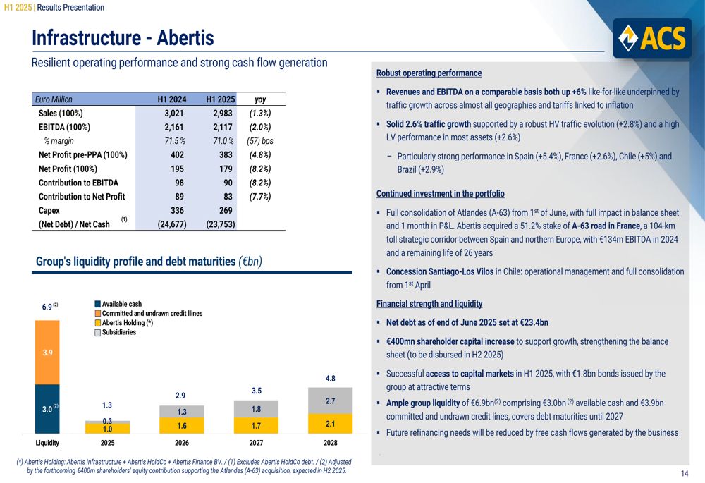 In contrast, the Infrastructure segment, which includes ACS’s stake in toll road operator Abertis, experienced a decline, with net profit decreasing by 7.1% (6.7% FX-adjusted). Abertis specifically saw an 8.2% decrease in sales and a 7.7% drop in net profit contribution, reflecting challenges in the toll road business.