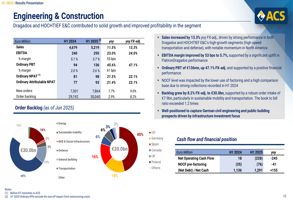 The Engineering & Construction segment also performed well, with attributable net profit rising 21.4% (22.1% FX-adjusted) to €93 million. Sales increased by 11.5% to €5.2 billion, with transportation projects accounting for nearly half of the segment’s order backlog.