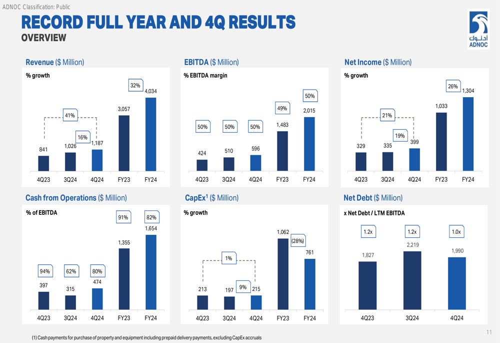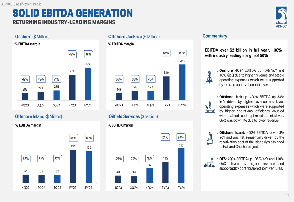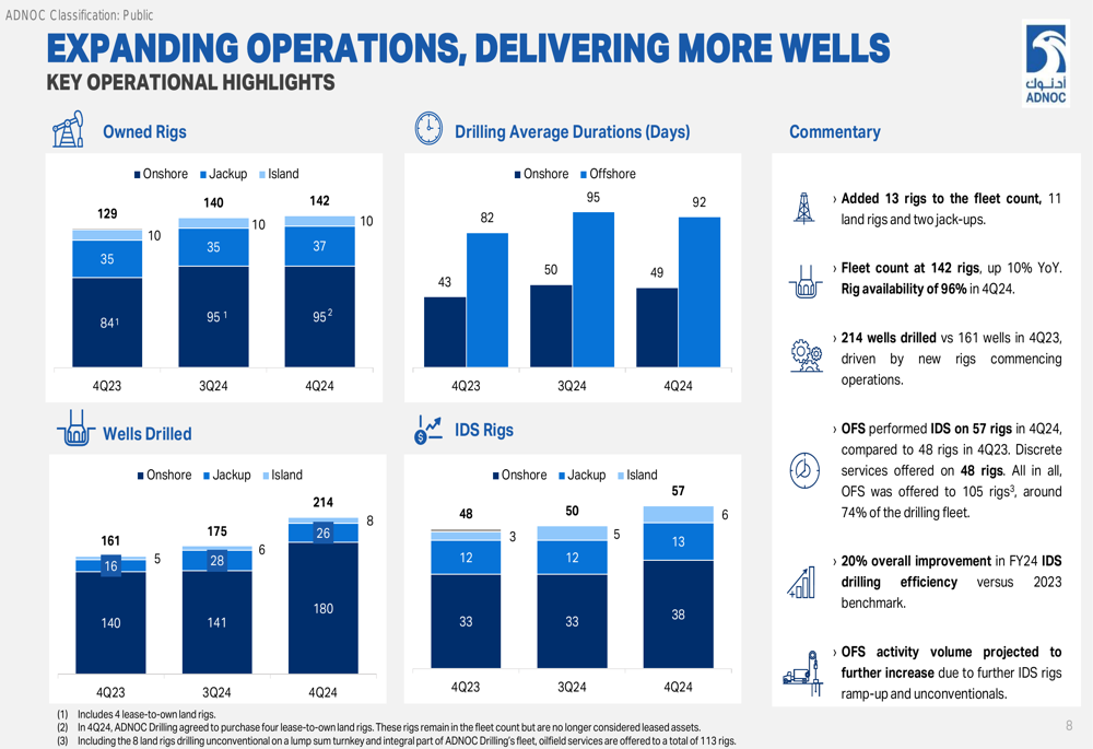 The company’s fleet expanded to 142 rigs after adding 13 new units during the year, with strong rig availability of 96% in Q4 2024. ADNOC Drilling also demonstrated its operational capabilities by drilling 214 wells in Q4 2024, compared to 161 wells in the same period of 2023.