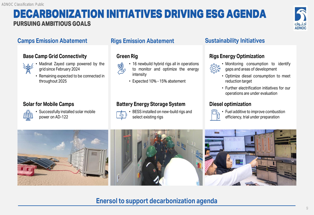 ADNOC Drilling is also advancing its ESG agenda through various decarbonization initiatives, including grid connectivity for base camps, hybrid "green rigs" expected to achieve 10-15% emissions abatement, and battery energy storage systems. The company reported a total greenhouse gas abatement of 38.7 KtCO2e in 2024 and an energy intensity of 2,565 GJ/$MM revenue.