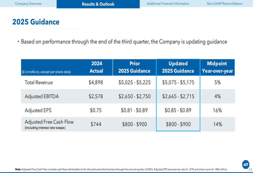 The following slide details ADT’s updated 2025 guidance across key financial metrics:
