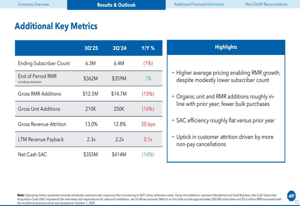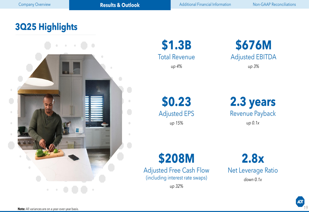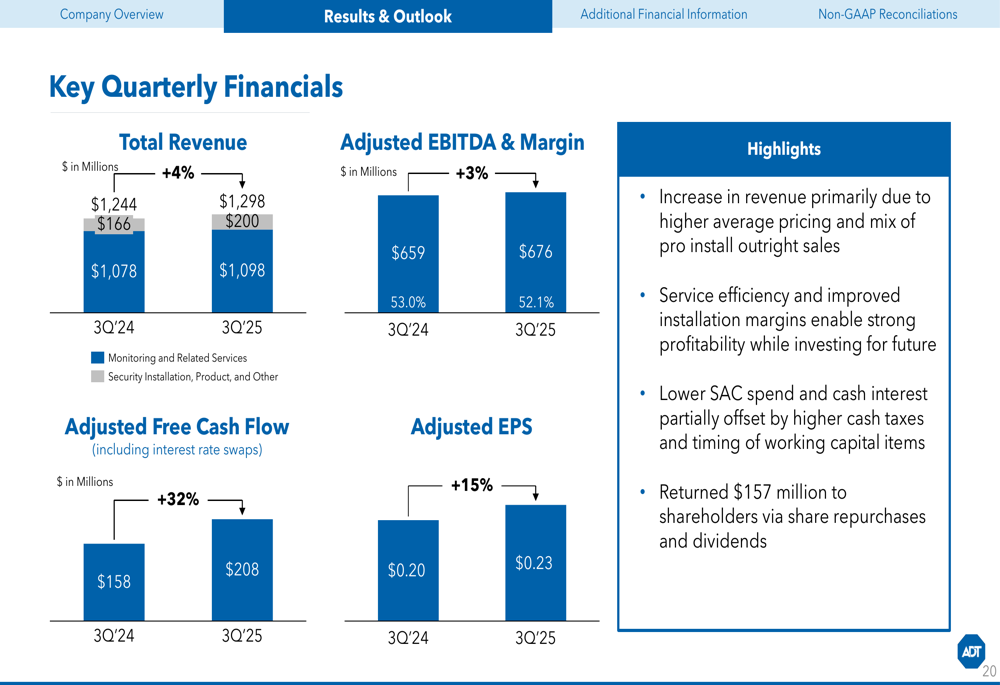 ADT reported total revenue of $1.3 billion for Q3 2025, representing a 4% increase year-over-year. Adjusted EBITDA grew 3% to $676 million, while adjusted earnings per share rose 15% to $0.23. The company also generated $208 million in adjusted free cash flow, a substantial 32% increase from the prior year.