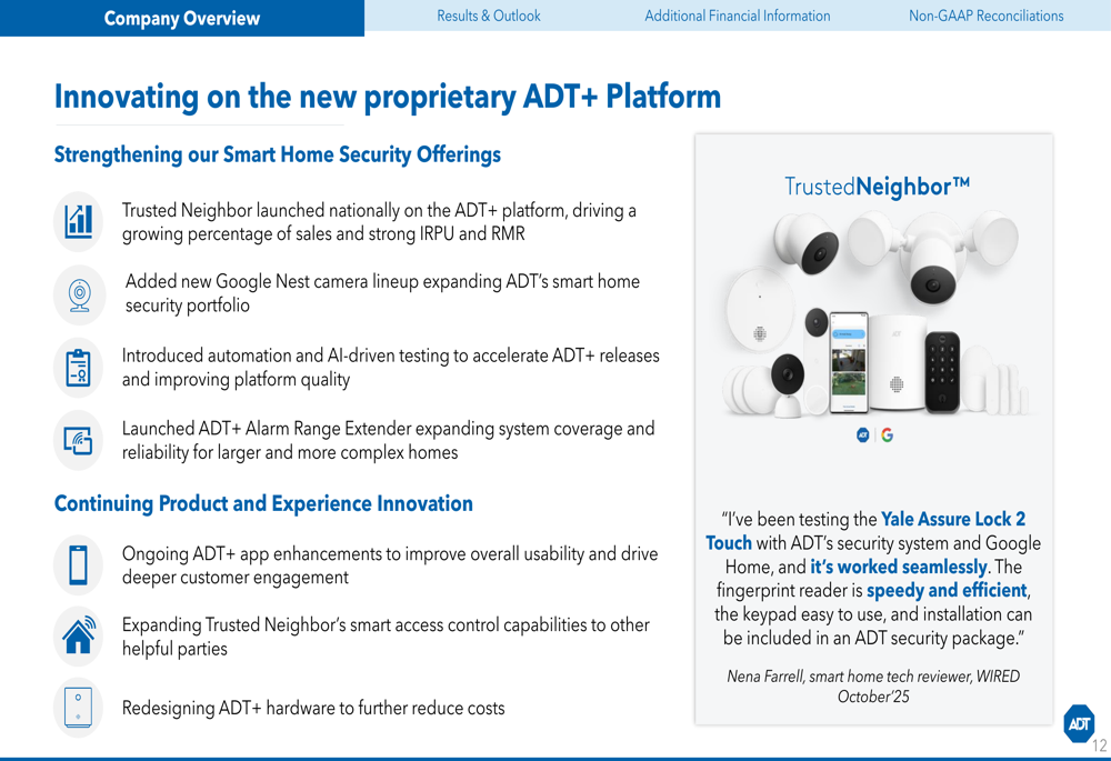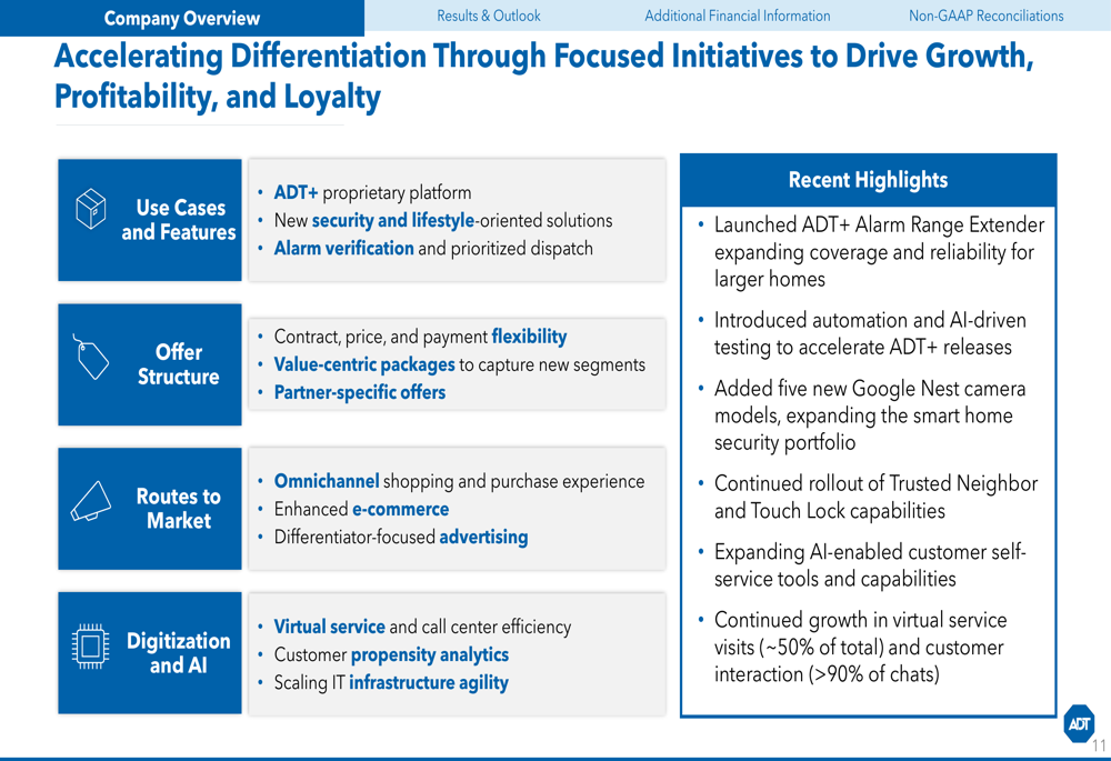 ADT continues to focus on innovation and differentiation to drive growth and customer loyalty. The company is leveraging its proprietary ADT+ platform to introduce new security and lifestyle-oriented solutions while enhancing its digital capabilities through AI and automation.