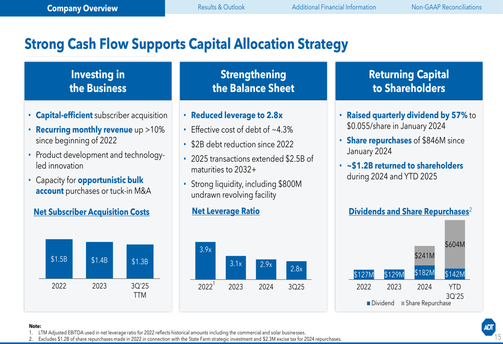 In the third quarter alone, ADT returned $157 million to shareholders through dividends and share repurchases, bringing the total capital returned to shareholders during 2024 and year-to-date 2025 to approximately $1.2 billion.